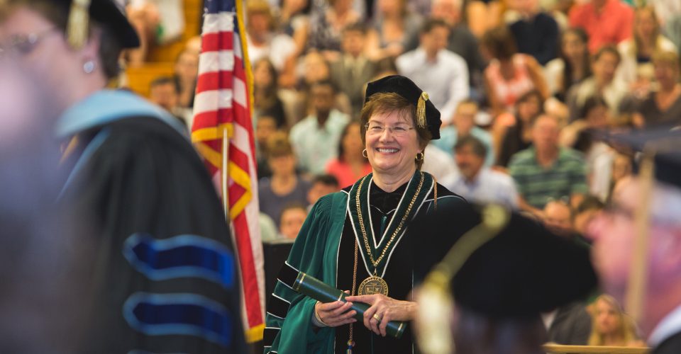 President Steen’s remarks were followed by words of wisdom from two distinguished alumni speakers. Honorary Doctorate of Business degree recipient John Garnsey ’73 recalled how he took a chance to work at a Colorado ski area and ultimately became the president for global mountain development with Vail Resorts. His mantra? “Follow your passion, wherever it takes you,” exhorted Garnsey. “Be it Wall Street, the classroom, or in the mountains like myself—it will certainly increase your chances for lifelong success and happiness.”