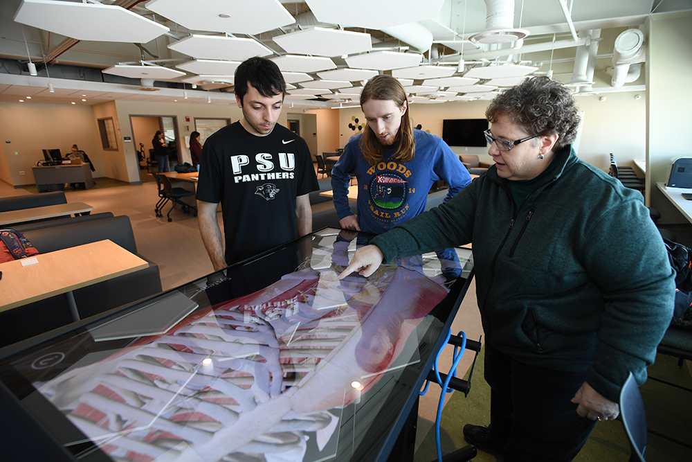 Professor Julie Bernier and students examine a “virtual cadaver” in the new Human Performance Center. Gil Talbot ’76 photo.