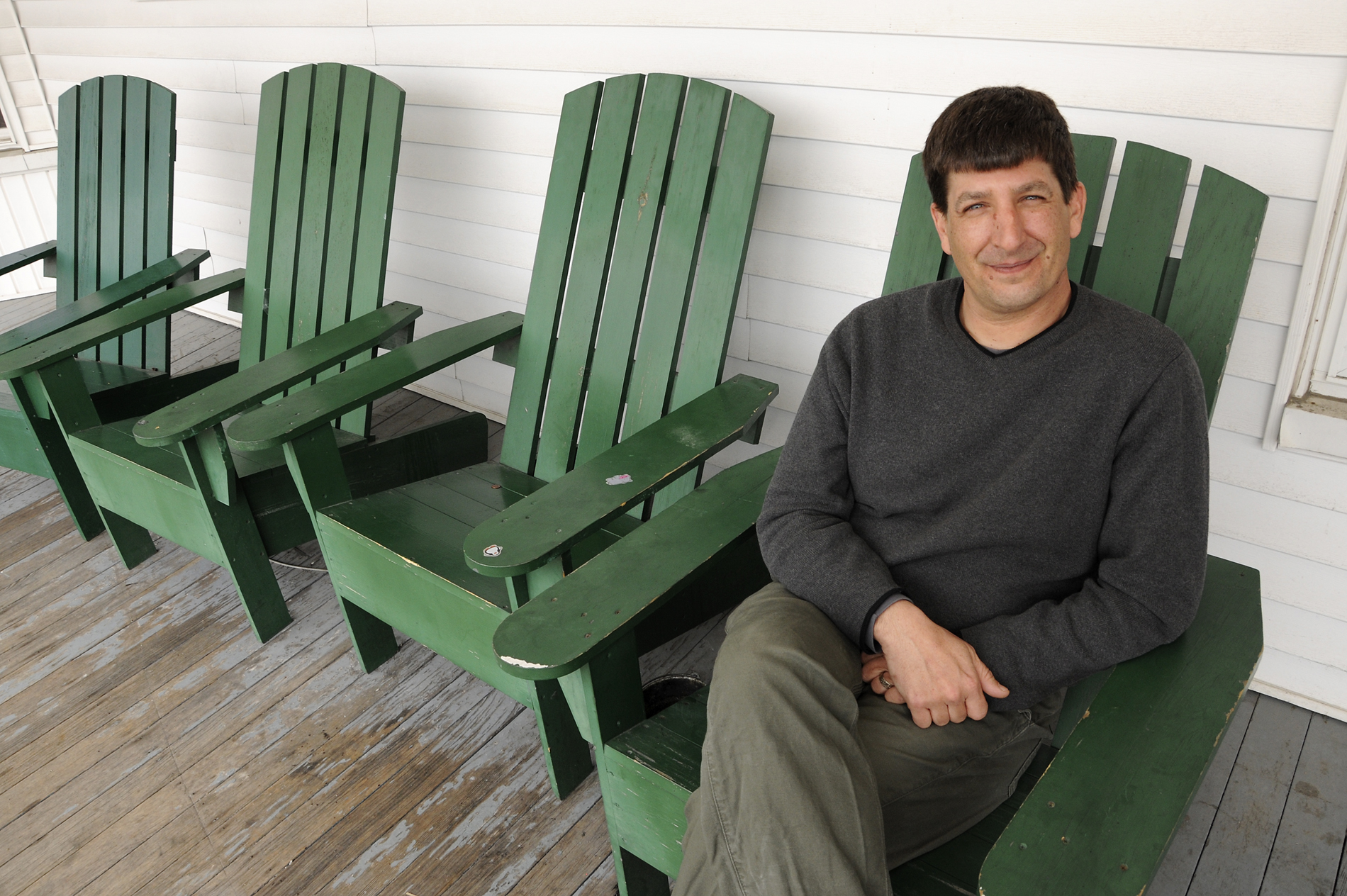 Professor Brian Eisenhauer on the porch of EcoHouse, home to the Office of Environmental Sustainability and a living and learning laboratory for students to practice living sustainably. Jon Gilbert Fox photo.