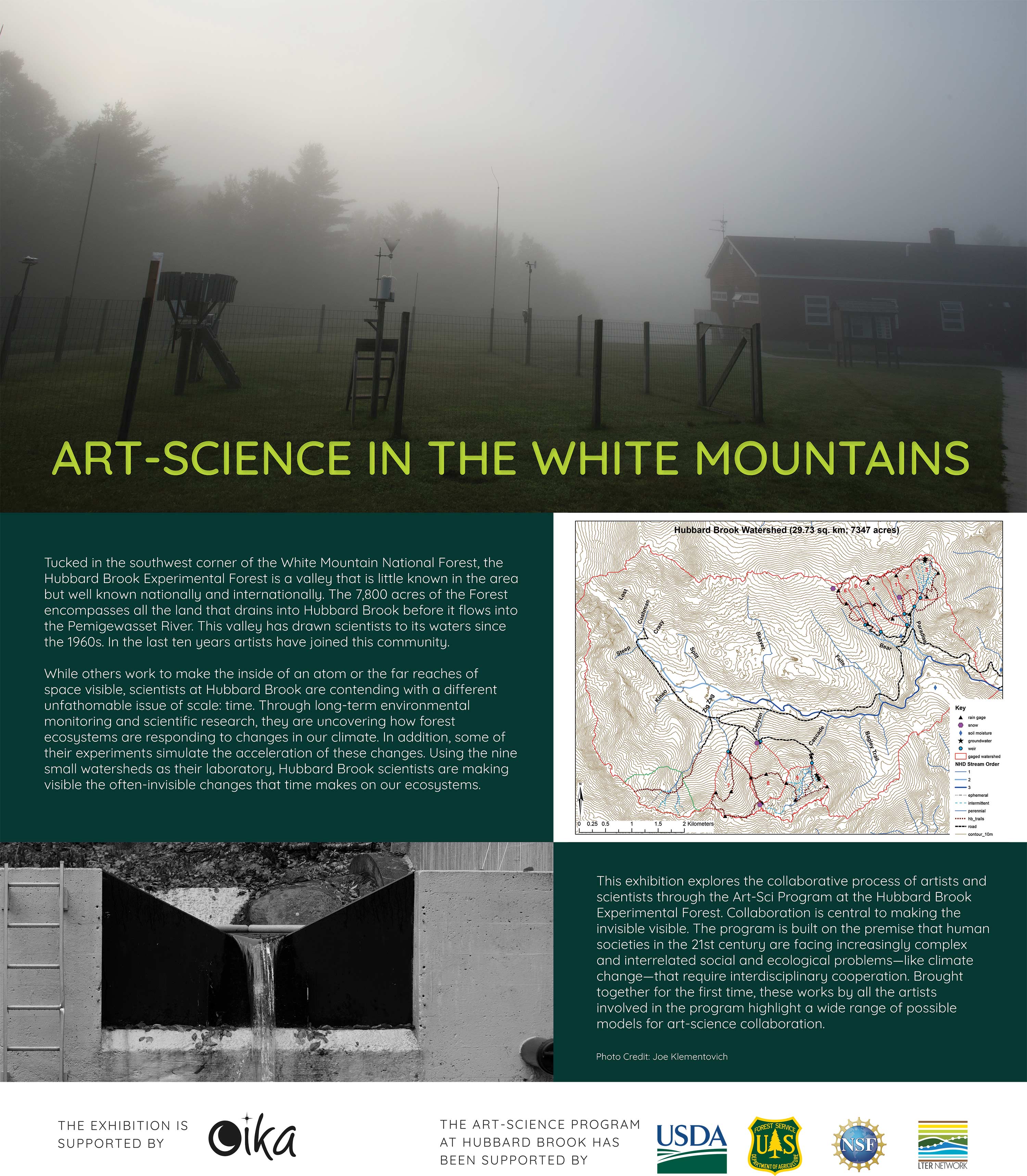 Tucked in the southwest corner of the White Mountain National Forest, the Hubbard Brook Experimental Forest is a valley that is little known in the area but well known nationally and internationally. The 7,800 acres of the Forest encompasses all the land that drains into Hubbard Brook before it flows into the Pemigewasset River. This valley has drawn scientists to its waters since the 1960s. In the last ten years artists have joined this community.