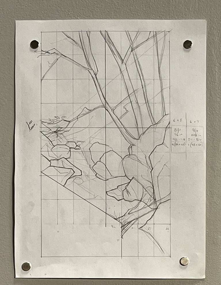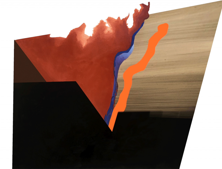 The revelation for me during this residency was learning how rocks are a dynamic and integral part of interconnected ecosystems. The processes these scientists are studying are geologic time in action. In response, I made a series of paintings–one of which is included in this exhibition–making visible the relationship between the hydrology and topography of the forest, which impacts water flow; the process of water weathering bedrock; and the structure/composition of the rocks themselves. I incorporated Jenny’s thin sections of weathering bedrock, topographic maps, and crystal patterns in the rocks.