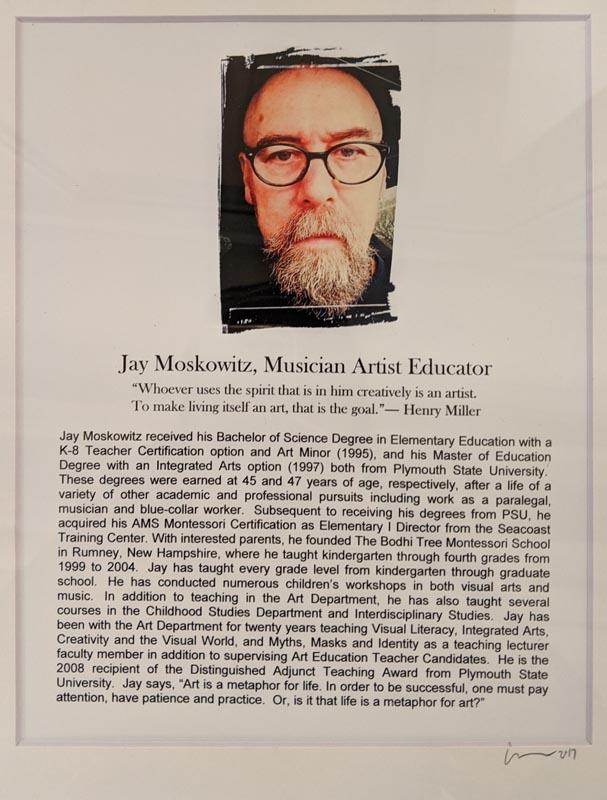 One of the best parts when I was at Plymouth State was being a part of the community that Draper & Maynard had and still has. Jay was a big part of that community and the Plymouth community. Whether he was helping in other art courses when he wasn’t teaching, coming in to class to see what students were working on, supporting the arts at the museum, being on Plymouth’s campus, having chats in Monte Alto, making those around him laugh & smile, playing the guitar for everyone, or just talking to the students of PSU & the community of Plymouth. There are many moments I have been impacted by Jay, his words, and his kindness. Jay was such an incredible professor who will truly be missed.