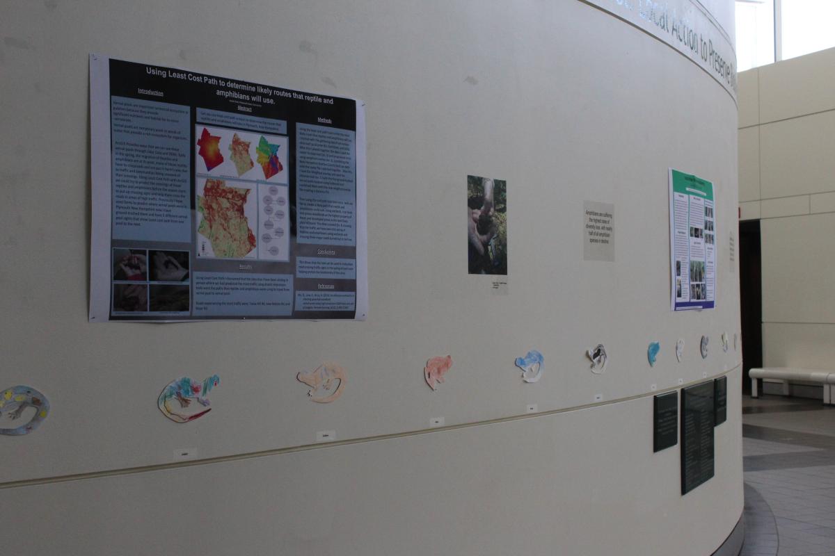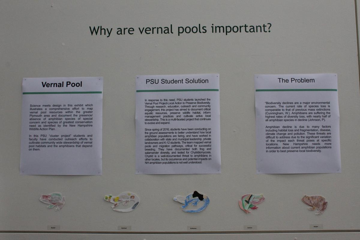 Science meets design in this exhibit which illustrates a comprehensive effort to map vernal pool resources within the greater Plymouth area and document the presence/ absence of amphibian species of special concern and species of greatest conservation need as identified by the New Hampshire Wildlife Action Plan. In this PSU “cluster project” students and faculty have conducted outreach efforts to cultivate community wide stewardship of vernal pool habitats and the amphibians that depend on them.