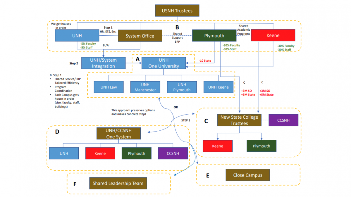 Option A has Plymouth, Keene, UNH, and UNH Manchester absorbed into one unified university. Plymouth and Keene would no longer be standalone schools, instead becoming UNH Plymouth and UNH Keene.