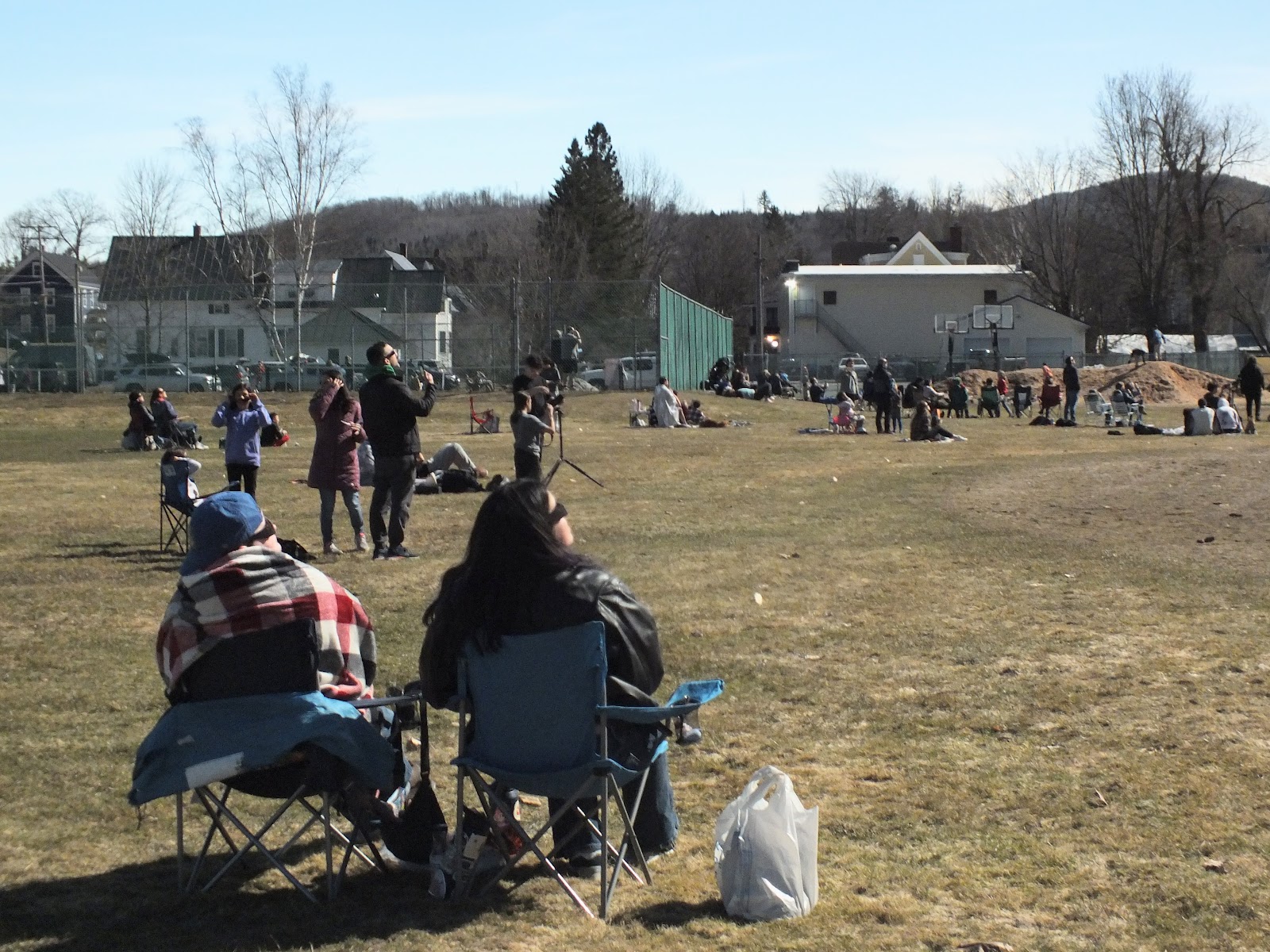 Lancaster rests on New Hampshire’s western border. It has one supermarket and two covered bridges. We drove in on dirt roads and winding state highways along the Connecticut River, lined with cow pastures and collapsed barns and rusty tractors. The small town, which has a population of around 3,200 people, prepared for as many as 40,000 eclipse tourists. As the eclipse neared, parked cars – Subarus with bumper sticker plastered backs – crowded the shoulders of roads into town. Eager tourists stared into the sky with cardboard glasses and elaborate telescopes and cameras from the side of the road.